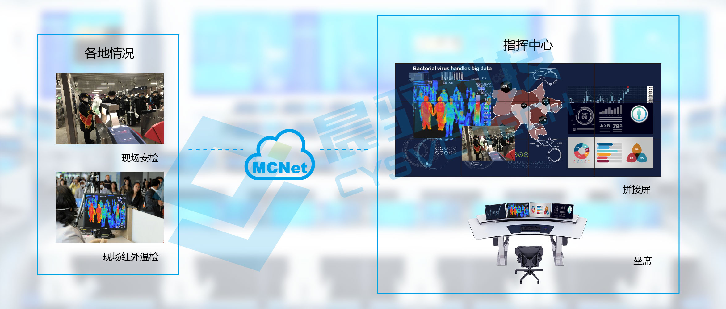针对机场、火车站防疫后续工作涉及业务广、部门多、跨地域等特点,晨驭科技首先采用MCNet分布式可视化坐席协作管理系统,以基于全IP数字化信息传送与音视频处理技术为一体的数字KVM坐席协作管理系统,将机场TOC与AOC两大业务单元,交通枢纽运营中心与列车运营调度指挥中心两两结合交互,实现一人多机、一机多屏的高效数据共享与比对。坐席员能够及时对疑似发热旅客的监控图象展开身份查验,联动可能发生疫情的航班信息,做到数据一键上屏展现;对于更为复杂的跨平台业务——如联动民航局、卫生检疫局公开数据进行业务操作等,则能依照不同的权限等级,使用MCNet分布式KVM系统,做到图像的一键推屏、抓屏,快速完成跨业务单元数据比对与研判分析。