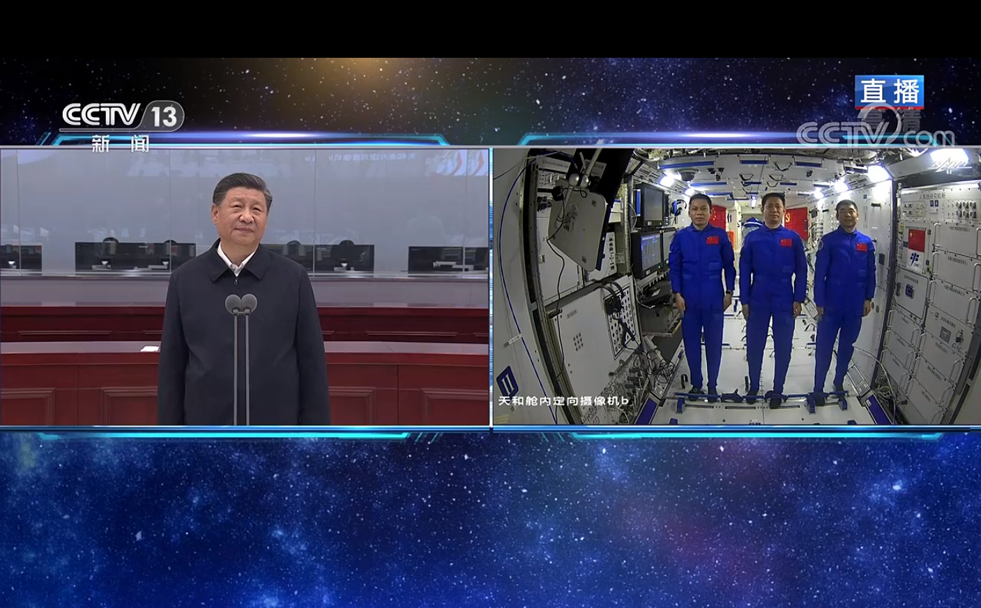 北京时间6月23日上午,中共中央总书记、国家主席、中央军委主席习近平来到北京航天飞行控制中心,通过指挥大厅的巨型电子屏幕,同正在天和核心舱执行任务的神舟十二号航天员聂海胜、刘伯明、汤洪波进行了超清、实时、双向的天地视频对话,代表党中央、国务院和中央军委,代表全国各族人民,向他们表示诚挚问候。